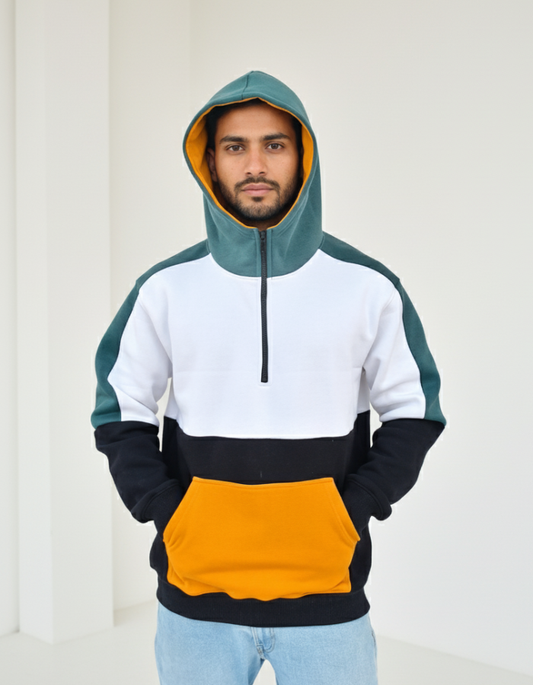 Colour Block Fleeced Hoodie - Teal, White, Mustard & Black